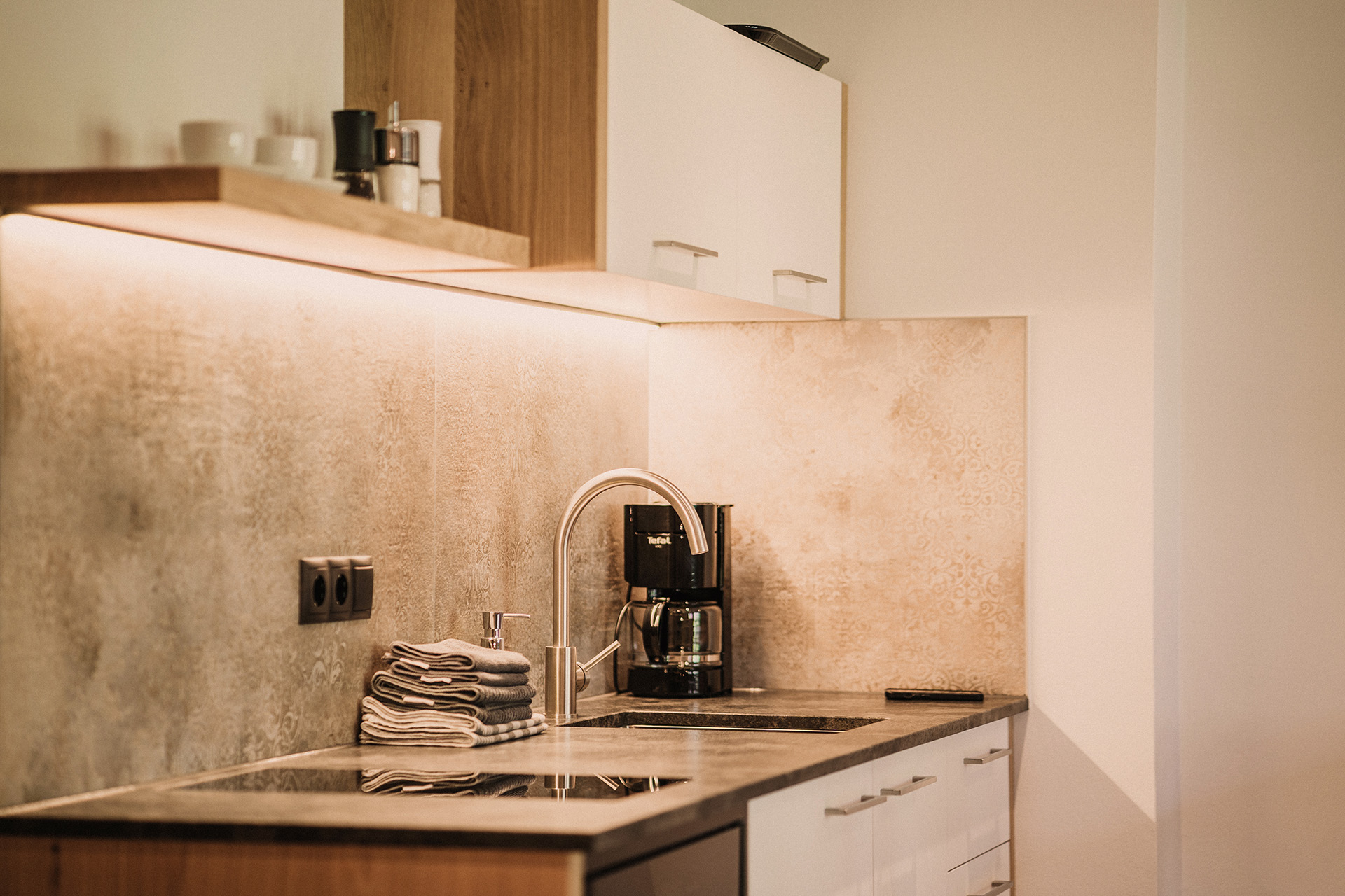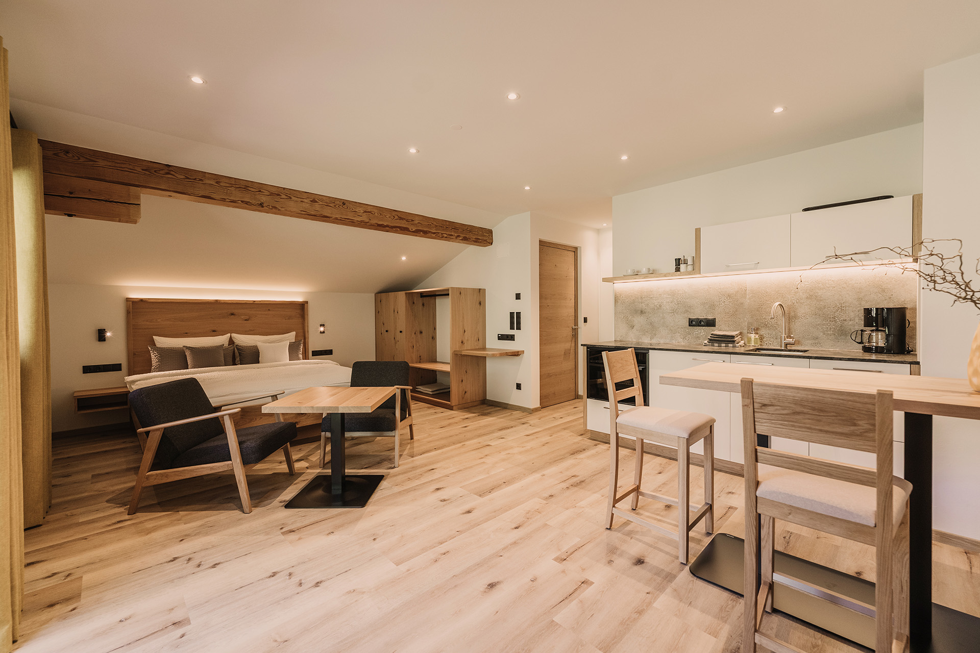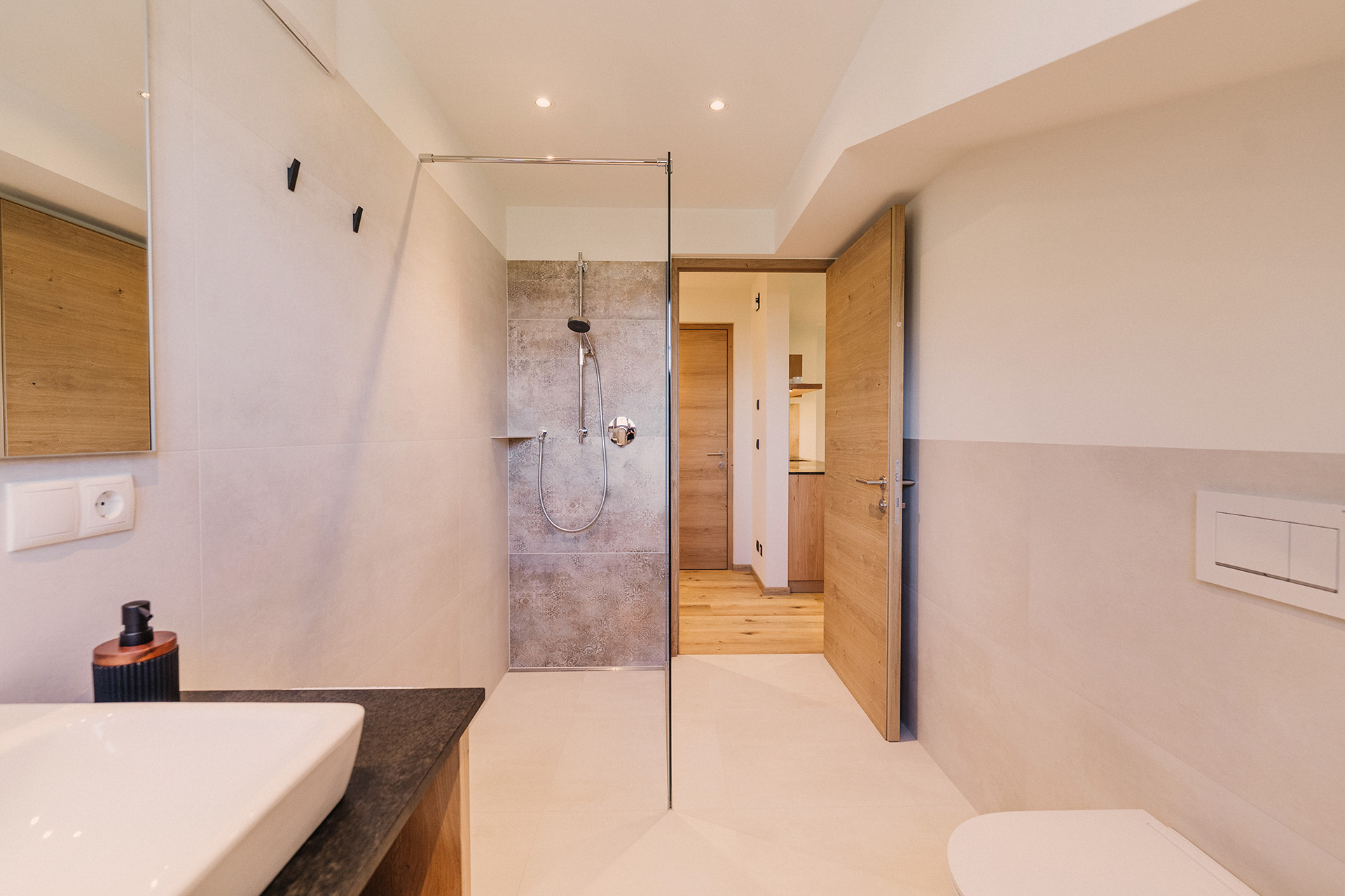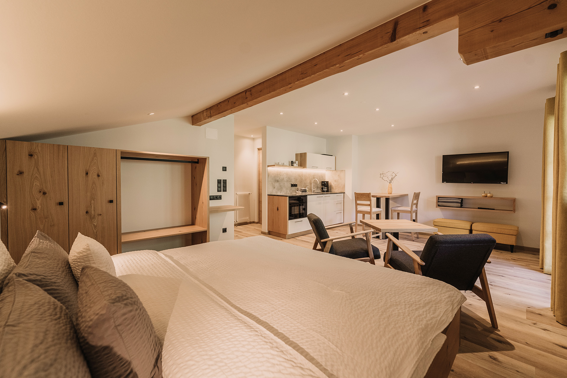 Gemütlich ausgestattetes großräumiges Einzimmerapartment mit integrierter Küche und Bad mit begehbarer Dusche. Großzügiger, möblierter Balkon mit schönem Ausblick auf den unverbauten Obstgarten und die herrliche Bergwelt.