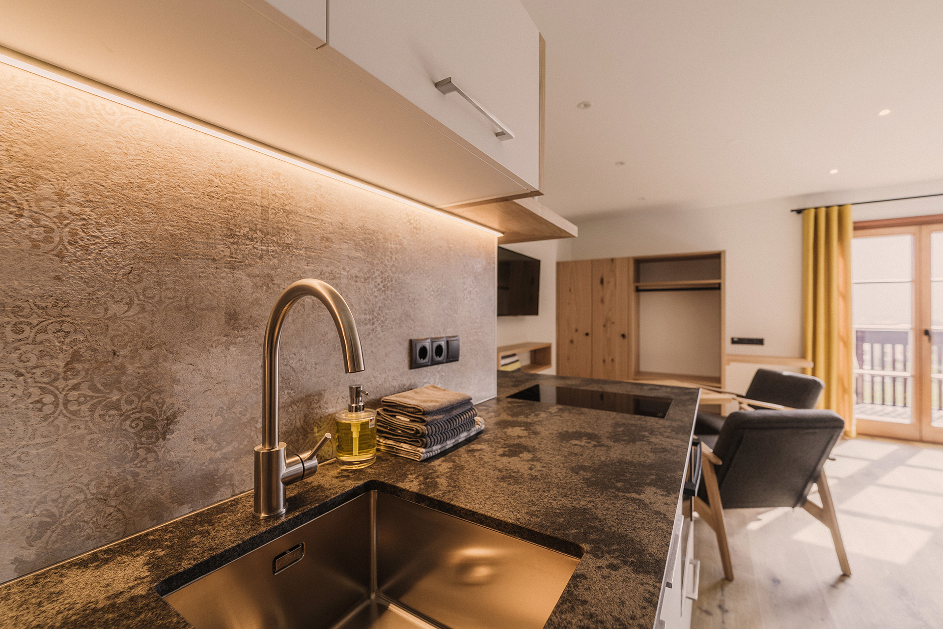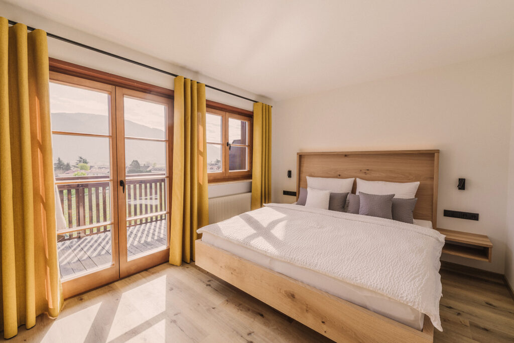 Behagliches Einzimmerapartment mit integrierter Küche und Bad mit begehbarer Dusche. Gemütlicher, möblierter Balkon mit herrlichem Ausblick über das Etschtal und die umliegende Bergwelt.